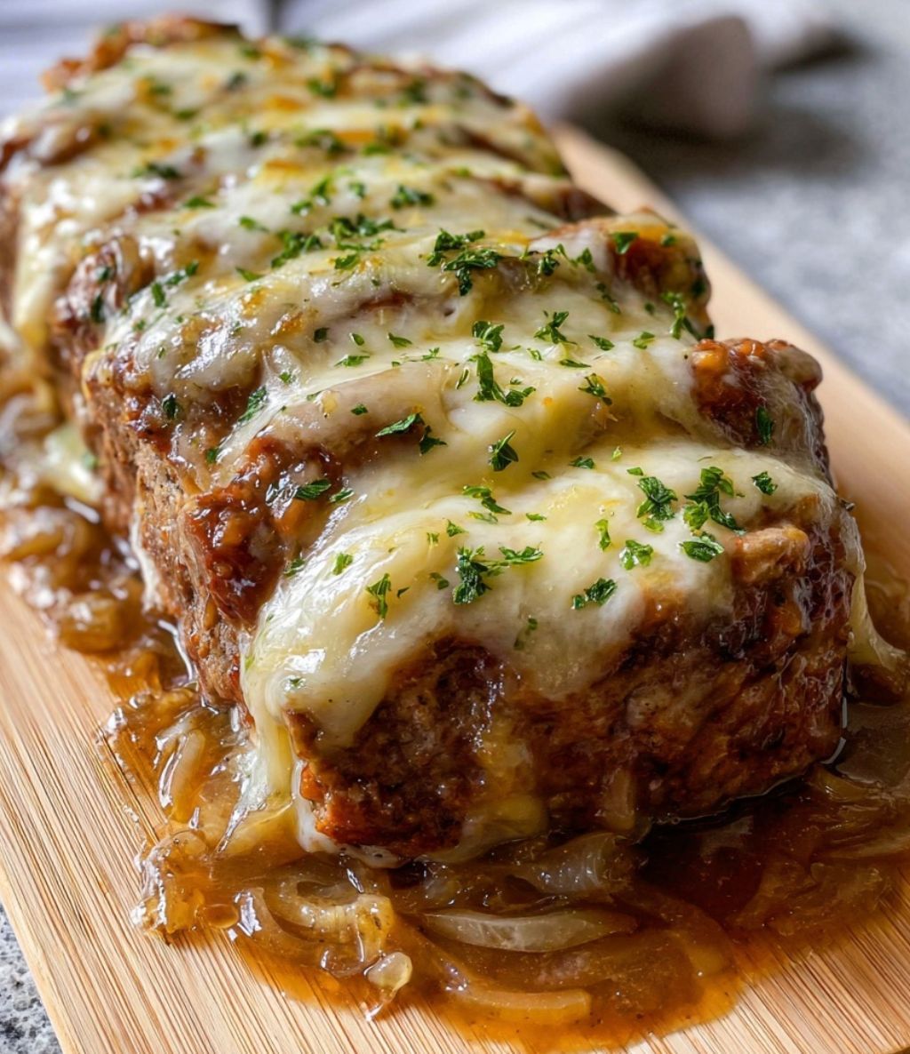 A delightful fusion of French onion soup and classic meatloaf, topped with creamy Swiss cheese. This dish offers a unique twist on traditional comfort food, combining savory flavors to create a gourmet experience.