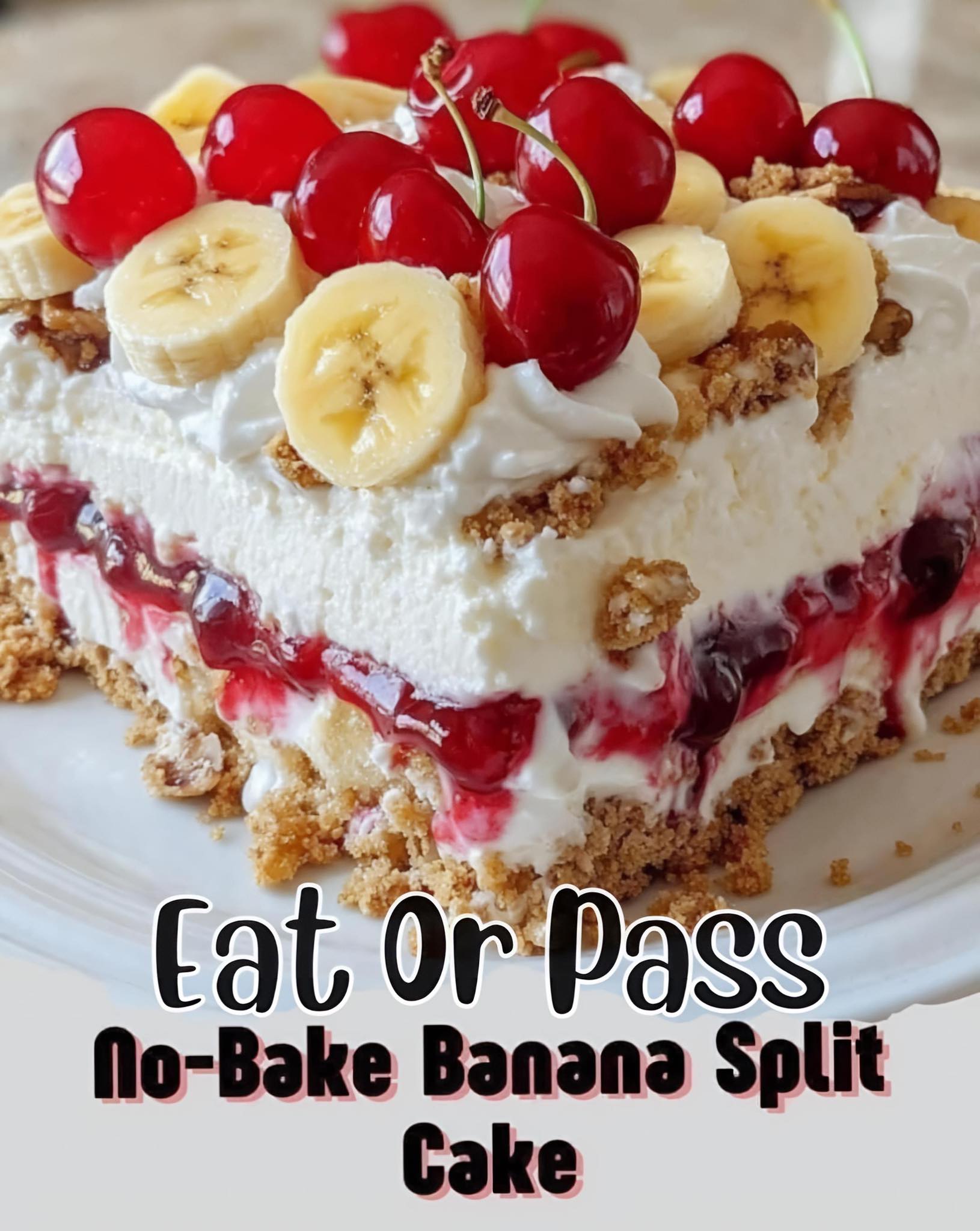 This Banana Split Cake is a no bake dessert with a graham cracker crust, followed by layers of sweetened cream cheese, sliced bananas, crushed pineapple, whipped cream, and delicious maraschino cherries on top.