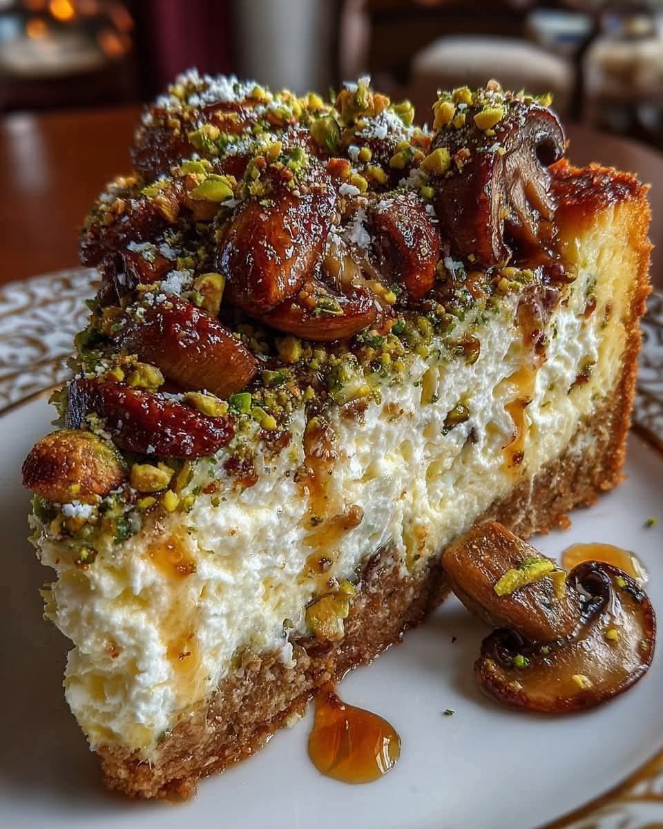 Pistachio and Mushroom Cheesecake with Feta & Parmesan Crust