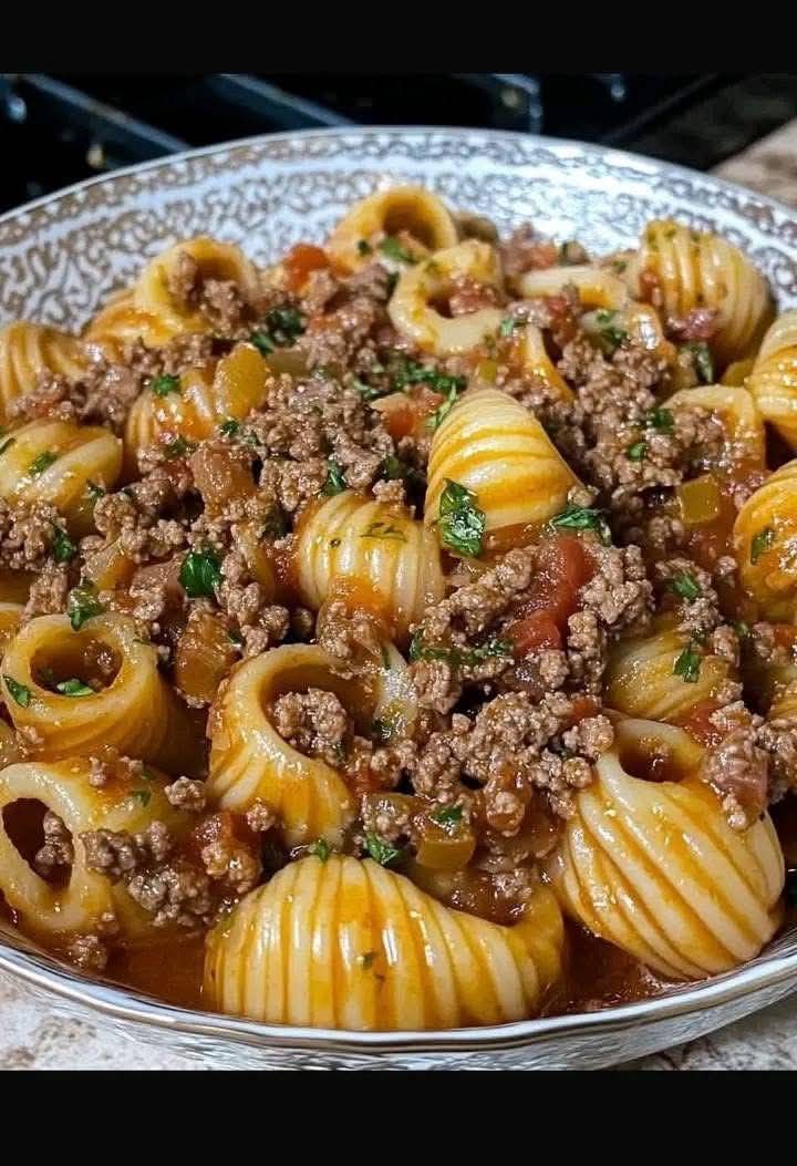 The dish features a familiar and comforting combination of pasta and meat sauce.